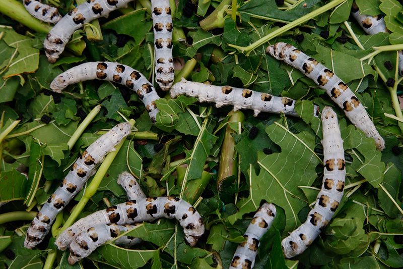 カイコは一度に300~400粒の卵を産む。孵化した直後は糸くずほどの大きさだが、4回の脱皮を経て体重は1万倍に成長する。
