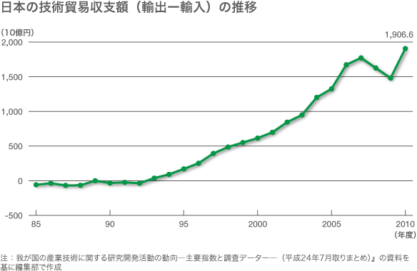 国土が狭く、天然資源にも恵まれない日本の企業にとって、技術力の高さは生命線。かつて日本製品のセールスポイントは「安くて高品質」だった。その後、各企業が研究開発に力を注ぎ、独自のテクノロジーを蓄積したことで、これに高性能や高機能という付加価値を加えることに成功した。現在、国籍別の特許新規登録件数では日本がトップの座をキープしており、日本が研究開発に力を注いでいることがわかる。また、特許などの技術使用料の輸出入を示す技術貿易収支も、90年代半ばから大きく改善している。