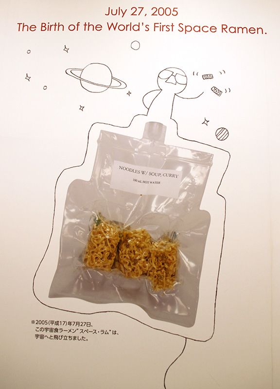 同社では2005年、宇宙食ラーメン「スペース・ラム」を開発。無重力の空間では、麺がばらばらになってしまうので、麺のまわりを卵白でコーティングし、一口サイズのかたまりにした。スープも飛び散らないよう、とろみをつけた。宇宙では味覚が鈍るので味付けは濃いめ。さらに、スペースシャトル内では、気圧が低くお湯が沸騰しないので、70℃のお湯でも戻るよう麺の小麦粉やでんぷんの配合を調整した。