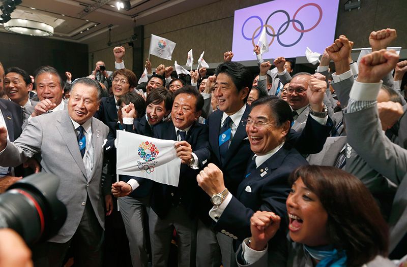 2020年東京オリンピック・パラリンピック開催決定で喜ぶ一団。(ロイター/アフロ)