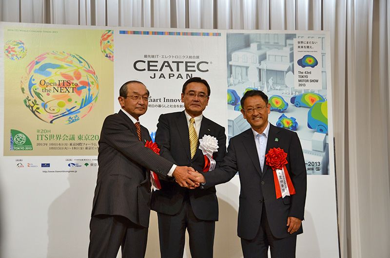 今秋は、シーテックに続き、10月14-18日にITS(高度道路情報システム)の国際会議「ITS世界会議東京2013」、11月22-12月1日には「第43回東京モーターショー」が相次いで開催。フォトセッションは3イベント連携の発信を狙ったものだが、豊田会長にひときわ注目が集まり、自動車がそのリード役であることを示す形になった。