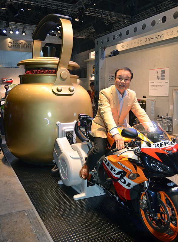 巨大なやかんにつながったバイクにまたがるホンダの伊東孝紳社長