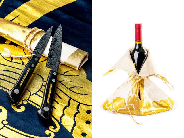 京セラと共同で制作した和柄のナイフ、西陣織のカバー/西陣織で作ったワインカバー