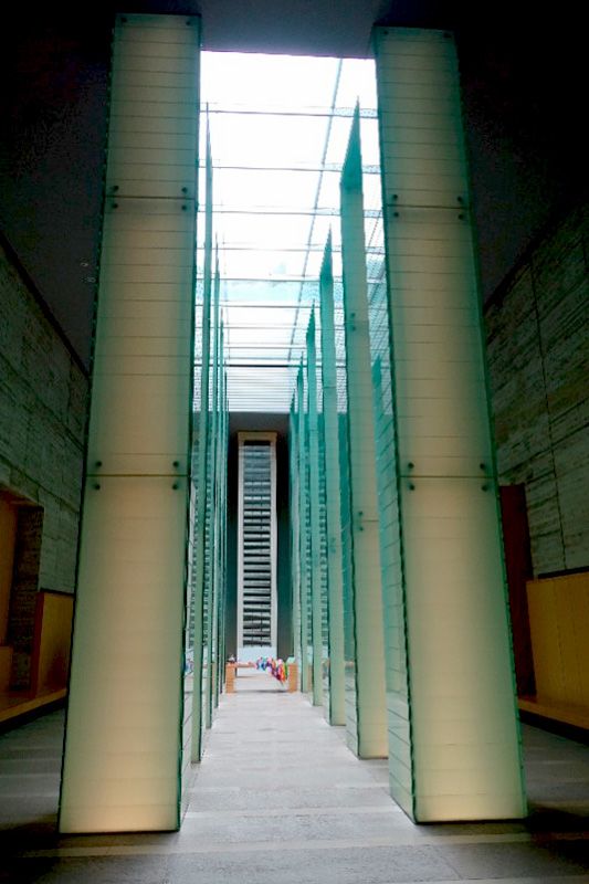 国立長崎原爆戦没者追悼平和祈念館の地下2階にある「追悼空間」にある12本のガラスの柱と、原爆戦没者を収めた名簿棚