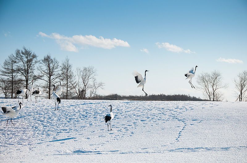 雪原の上でタンチョウが優雅に舞う。オスが「クォーッ」と鳴くと、すくにメスが「カッカ」と応える。くちばしから白い息が立ち上る。2羽が同時に雪を蹴って大きく飛び上がった。そろそろ、カップルをつくる準備だ。