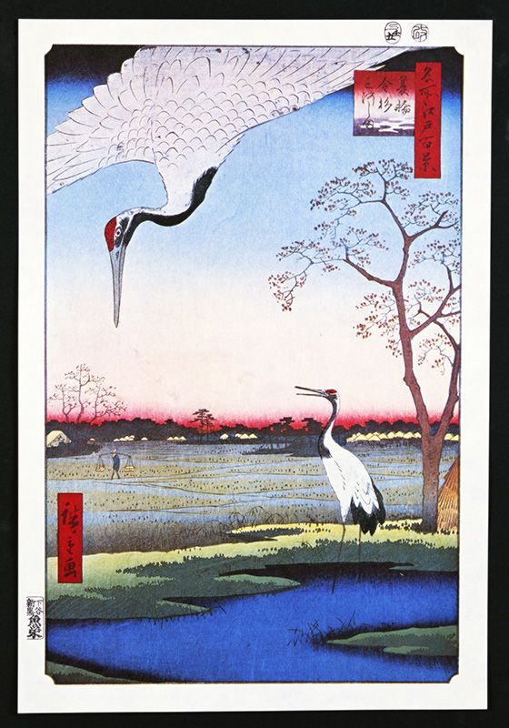 江戸末期の浮世絵師、歌川広重は「名所江戸百景」の中で江戸に飛来していたタンチョウを描いている。絵の上の方から、タンチョウの上半身が覆い被さるような構図が斬新だ。この絵が描かれたのは1856〜58年、場所は荒川南岸の湿地帯とみられる。この辺りは、将軍家の御狩場だった。