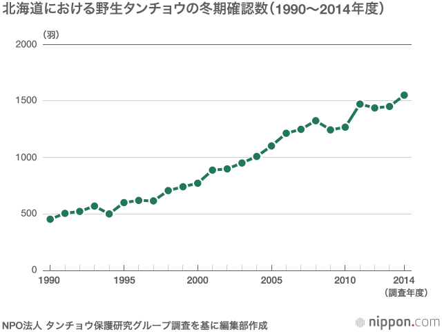 2004年には待望の1000羽の大台に乗って、「千羽鶴」を達成した。そして16年には1800羽に達した。この回復にもっとも貢献したのは、冬季の餌やりだった。それまでは、冬季の食糧不足から生息数は思うように伸びなかったからだ。
