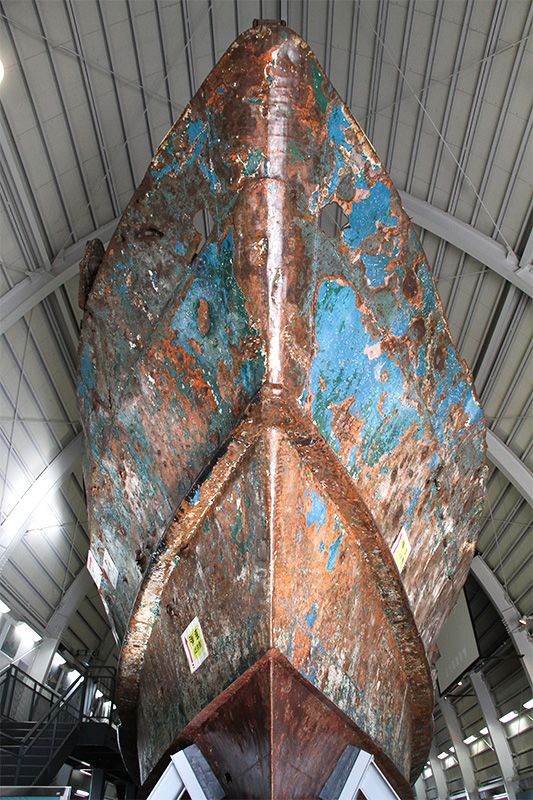 展示の目玉は、全長29.7メートルの工作船「長漁3705」だ。沈没して長期間水中にあったためさびついており、多数の弾痕も残っている。船体上部は銃撃戦で大きな損傷を受け、操舵(そうだ)室やマストが破壊されているのが分かる。甲板には口径14.5ミリの二連装対空機関銃を出し入れするレールがあり、機関銃の設置場所はブリッジの背後に隠されている。