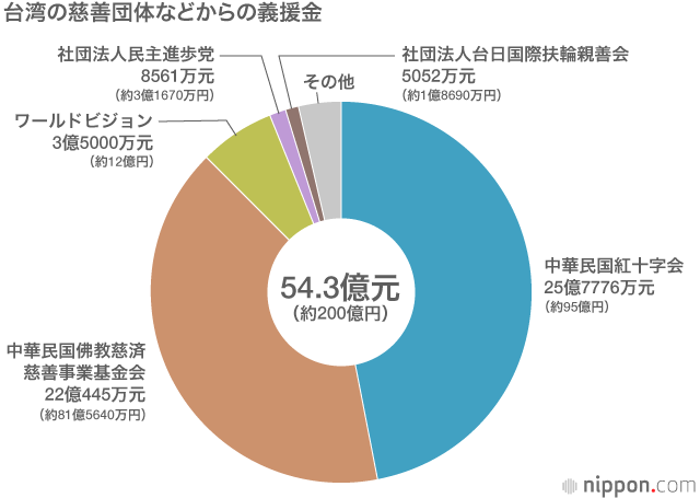 台湾の慈善団体などからは54億3145万元(約200億円)が届けられた。具体的な内訳や配布先は次の通り。