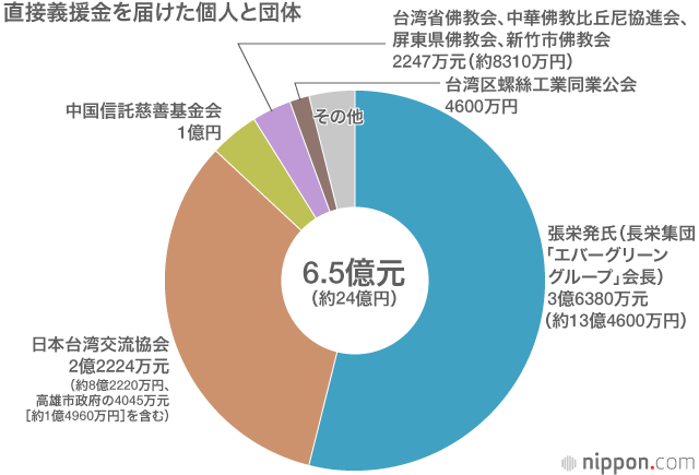 日本に直接義援金を届けた個人と団体からは、計6億5346万元(約24億円)が送られた。