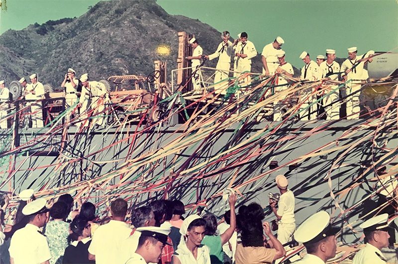 バナー写真:家族らの見送りの中、東海汽船「黒潮丸」に乗って24年ぶりに父島に帰郷する漁民=東京・港区の竹芝桟橋(時事)