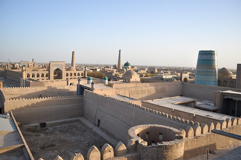 我々は首都タシケントから国内線で西方約1000キロの州都ウルゲンチに飛び、専用車(中国製大型バス、車内に洗面所装備)に乗り換えて古くからのオアシス都市、ヒヴァに向かった。ヒヴァには、城壁に囲まれたイチャン・カラ(内城)がほぼ中世の姿のまま残っている。