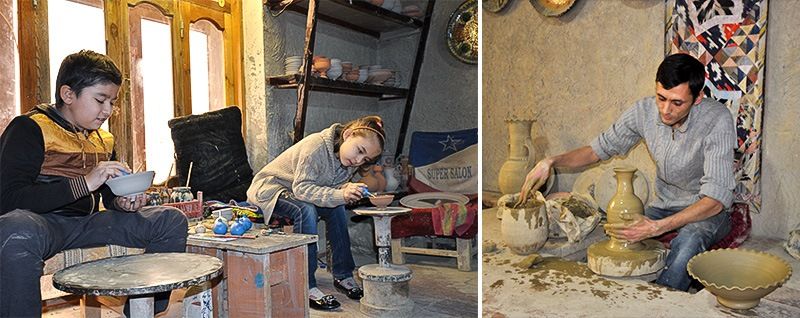 今回の旅行で、ブハラからサマルカンドへ行く途中、焼き物の町ギジュドゥヴァンを訪ねた。加藤幸兵衛氏を出迎えたのは「CERAMICS」の看板を掲げた工房の6代目の陶芸家、アリシェール・ナズラエフ氏(66)。同氏は1999年に半年間、小松市に滞在、九谷焼の技術研修を受けており、日本語も少し話す。幸兵衛窯は文化初年(1804年)開窯。ナズラエフ氏の工房の初代は1790年生まれだった。双方とも200年以上の歴史を持つ。加藤氏は先代の父、卓男氏と古代ペルシャの陶器で金属光沢を放つラスター彩を復元したことで知られ、何回もイランを訪問するなどシルクロードの歴史に詳しい。ナズラエフ氏とは初対面ながら、陶芸をめぐって話が弾んだ。