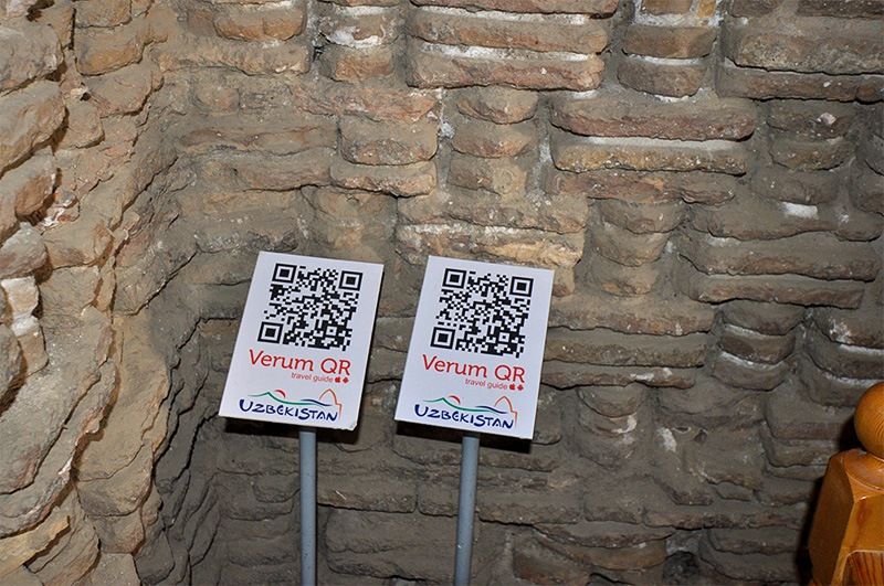 バーコード(QRコード)で説明を読み取れる遺跡の案内板=ブハラのイスマイル・サマニ廟