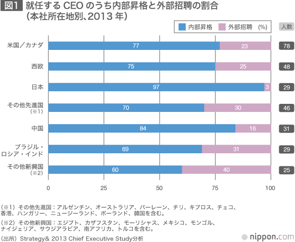 こうした外部からのトップ起用は、欧米企業では一般的だが、日本はまだ少ない。米国系経営コンサルティング会社「Strategy&」(日本法人名:プライスウォーターハウスクーパース・ストラテジー)がまとめた2013年の年次調査(世界の大手上場企業2500社を対象)によると、日本企業では新任CEOの97%が内部昇格者と圧倒的で、外部から招へいされたCEOは3%にとどまっている。米国・カナダでは外部招へいの割合は23%、西欧諸国では25%、エジプト、トルコ、南アフリカ、メキシコなどその他新興国では40%に達する。(図1、2)