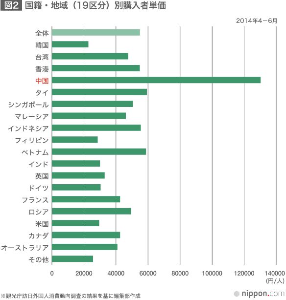 このサンプリング調査によると、訪日中国人1人当たりの買い物金額は13万0293円。調査対象となった19カ国・地域の平均5万4900円を大きく上回っている。2位はタイで5万9279円、3位がベトナムの5万8726円。欧米諸国は意外に低く、5万円を超えた国はなく、米国に至っては2万9425円だった。