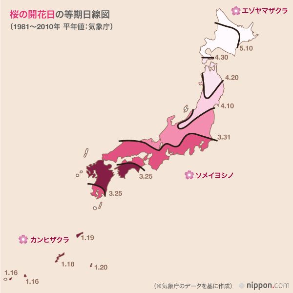 平年では、1月末~2月上旬にカンヒザクラの開花が始まる沖縄本島、奄美大島からスタートし、5月末に北海道東部でエゾヤマザクラが散るまでが日本の桜シーズン。ソメイヨシノは、3月下旬に高知県から開花が始まり月末には満開に、4月上旬には、九州、中国、四国瀬戸内海沿岸、近畿、中部、東海、関東が満開に、4月中旬に北陸、南東北が、4月下旬に北東北が、5月上旬には北海道西部が満開となる。