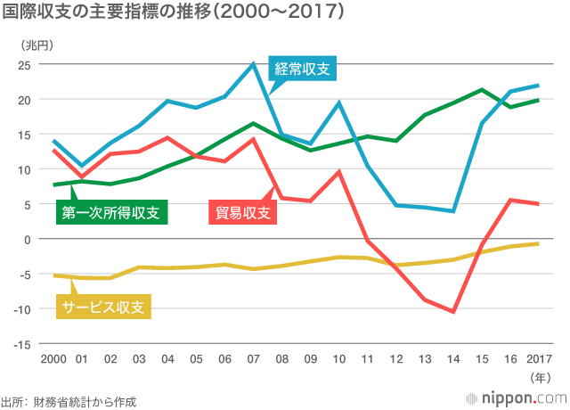 経常黒字は2010年(19.3兆円)以降減少し14年に過去最小(3.9兆円)を記録したが、15年には5年ぶりに反発しその後順調に増加している。2011年の東日本大震災前は貿易黒字が経常黒字をけん引してきたが、震災後は海外への証券投資や海外子会社からの配当金、旅行収支の改善などが支える構造変化が続いている。