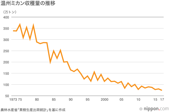 2017年の温州ミカンの収穫量は過去最低で、最盛期の1975年と比べると5分の1だった。生産者の高齢化が影響していると言われる。