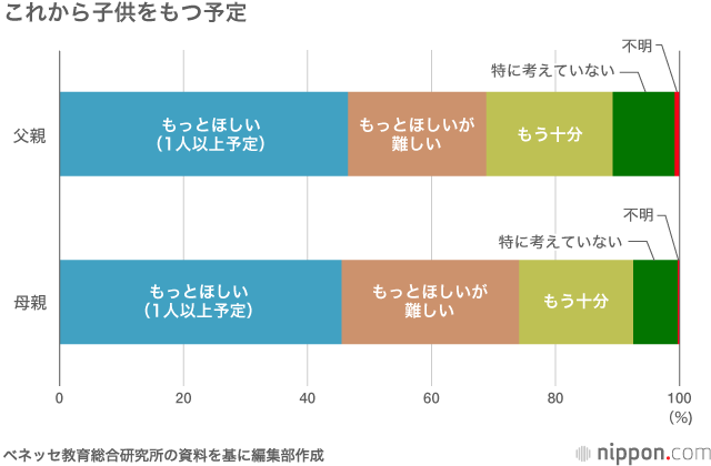 調査はベネッセ教育総合研究所と東大・発達保育実践政策学センターが全国の0~1歳児を子育て中の約3000世帯を対象に実施した。母親の74.1%、父親の68.8%が「子どもをもっとほしい」と考えているものの、母親の28.6%、父親の22.3%は「もっとほしいが難しい」と回答した。