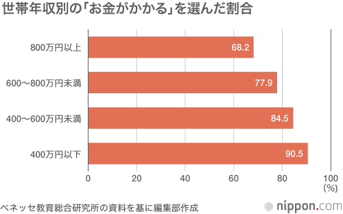 「お金がかかる」を選んだ人を世帯年収別にみると、「400万円以下」では90%を超えており、「800万円以上」の世帯でも68.2%に達した。公立の義務教育は無償だが、習い事や私立学校への進学など「よりよい教育を受けさせたい」との思いから教育への投資がかさむ現実がうかがえる。