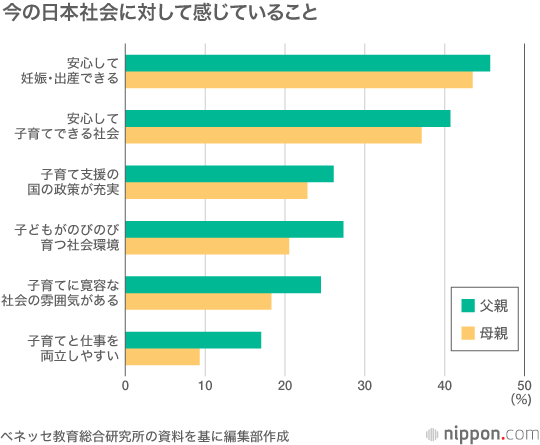 また、子育て環境についての質問では、「子育てと仕事を両立しやすい」「子育てに寛容な社会の雰囲気がある」と答えた母親はそれぞれ9.3%と18.3%と厳しい評価だった。