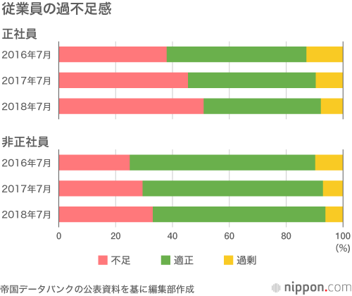 民間の調査期間帝国データバンクが発表した2018年7月の人手不足に対する企業の動向調査によると、正社員が不足していると答えた企業が50.9%となり、7月としては初めて過半数を超えた。16年7月は37.9%、17年7月は45.4%で、年々、人手不足感が強まっていることがあらためて浮き彫りとなった。