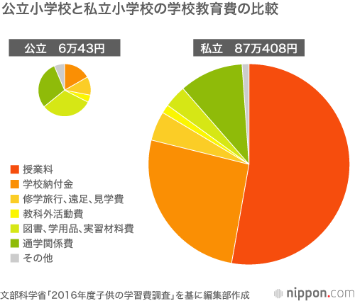 文部科学省の「2016年度子供の学習費調査」によると、保護者が1年間に支出した子供1人あたりの学習費総額(学校教育費、学校給食費、学校外活動費の合計)は、公立小学校か私立小学校かで4.7倍の開きがあるなど、「公私格差」が大きい。