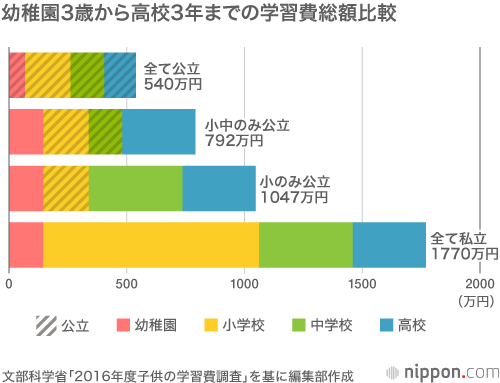 「全て公立」540万円、「全て私立」1770万円 : 幼稚園から高校までの学習費支出3倍以上の格差
