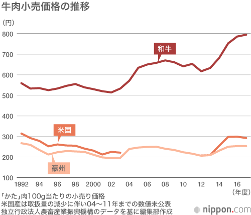 農畜産業振興機構の調査によると、17年度の牛肉の小売価格(かた肉、100gあたり)は米国産292円に対して、和牛は795円と2.5倍以上の差がついている。畜産農家の高齢化が進んでおり、肥育に手間のかかる和牛は、需要に見合う供給量が確保できず、価格の高騰が続いている。