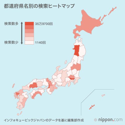 海外向けのデジタルマーケティング支援などを行うインフォキュービック・ジャパン(本社東京)が2017年4月からの1年間、13の国と地域から英語でグーグル検索された都道府県名を分析。1位の東京が35万9700回、2位秋田は35万310回で、3位以下を大きく引き離した。