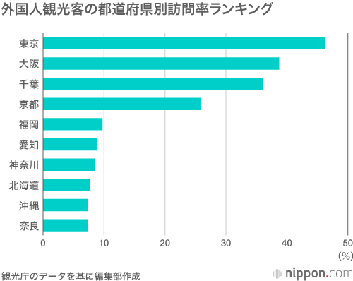 観光庁が公表している「2017年外国人観光客の都道府県別訪問率ランキング」と照らし合わせると、検索トップ10と訪問率はおおむね比例している。しかし、検索2位の秋田と9位の高知は、訪問率では47都道府県中それぞれ40位と45位に甘んじる。