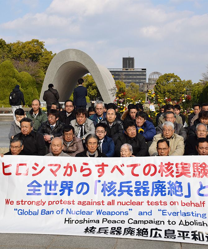 北朝鮮の水爆実験実施の発表を受け、平和記念公園内の原爆死没者慰霊碑前で抗議の座り込みをする被爆者団体のメンバーら=2016年1月7日午後、広島市中区(時事)