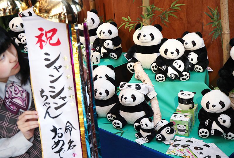 上野動物園のジャイアントパンダの赤ちゃんの名前が「シャンシャン(香香)」に決まり、パンダの縫いぐるみ売り場でお祝いのくす玉を割る人形専門店「久月」の職員=25日、東京都台東区の同本店(時事)