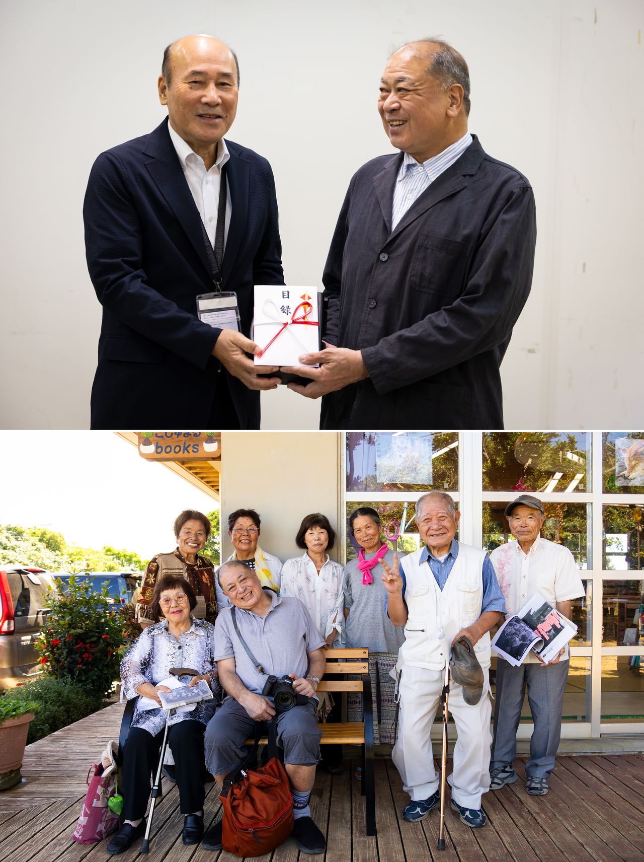 上から、奄美市に写真データを手渡す芳賀日向さん(右)、沖永良部では島民が歓待(共にニッポンドットコム編集部撮影)