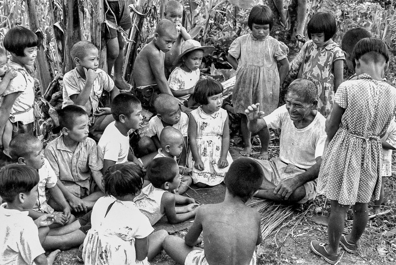 沖永良部島の昔話「むんがたい」の朗読風景。聞き書きの記録は残るが、抑揚やアクセントは当時の記憶が頼り(芳賀日出男撮影)