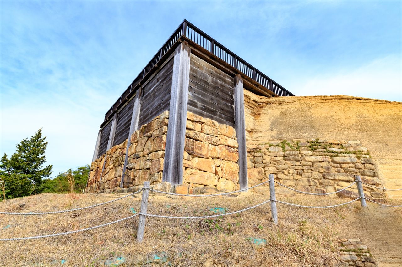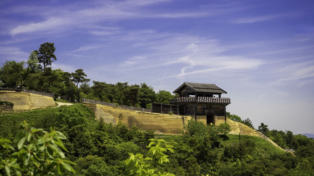 現在、西門が推定復元されているほか、城壁に沿ってウオーキングコースが整備されていて、絶景ポイントとしても人気。麓の鬼城山ビジターセンターでは、鬼ノ城全体や西門の模型など、城に関する展示が行われている。