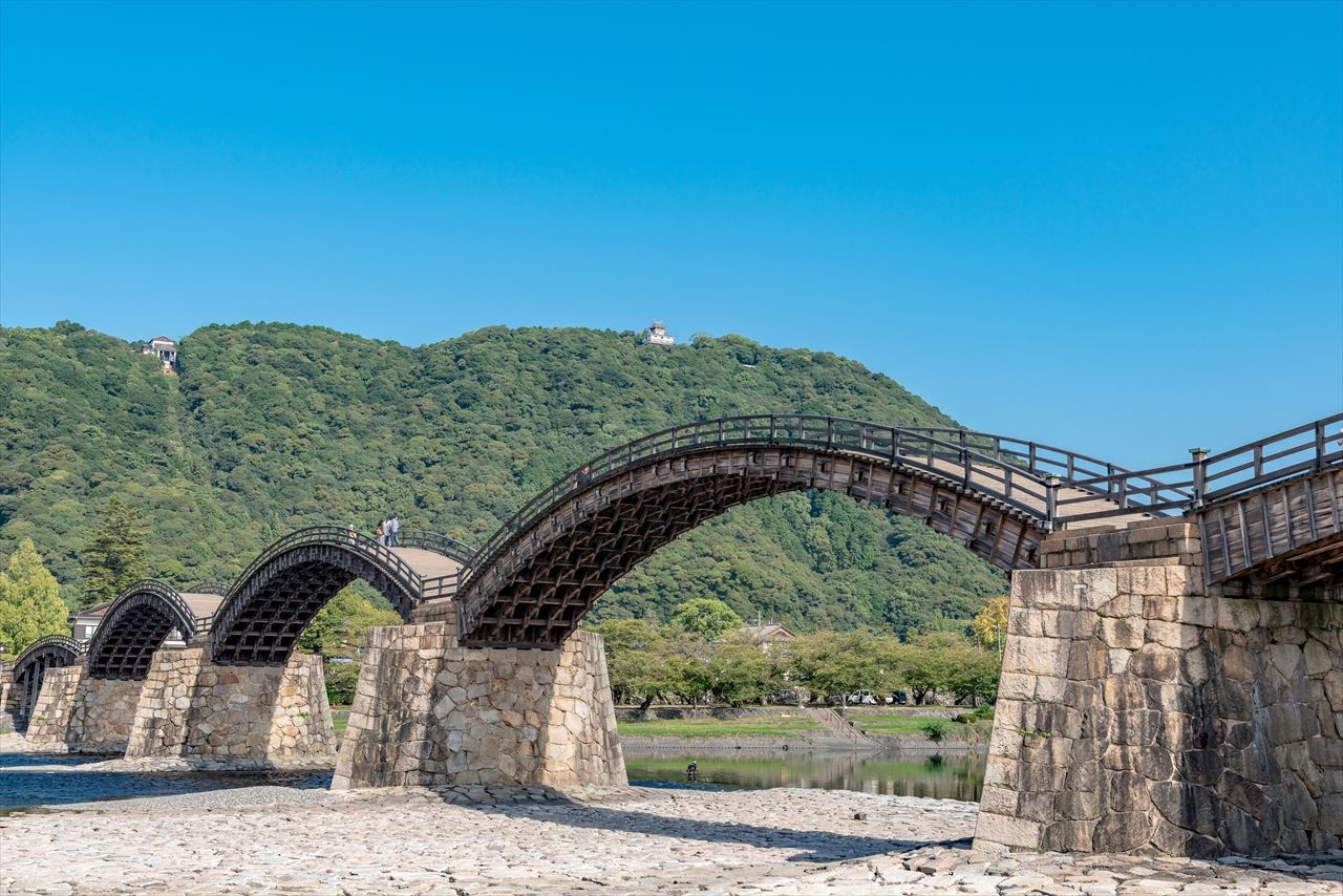 岩国城は中国地方の覇者、毛利氏の分家に当たる吉川氏が築いた山城。世界でも珍しい5連アーチの木造橋として知られる錦帯橋(きんたいきょう)は、麓にある城主の居館と城下町をつなぐために造られた。