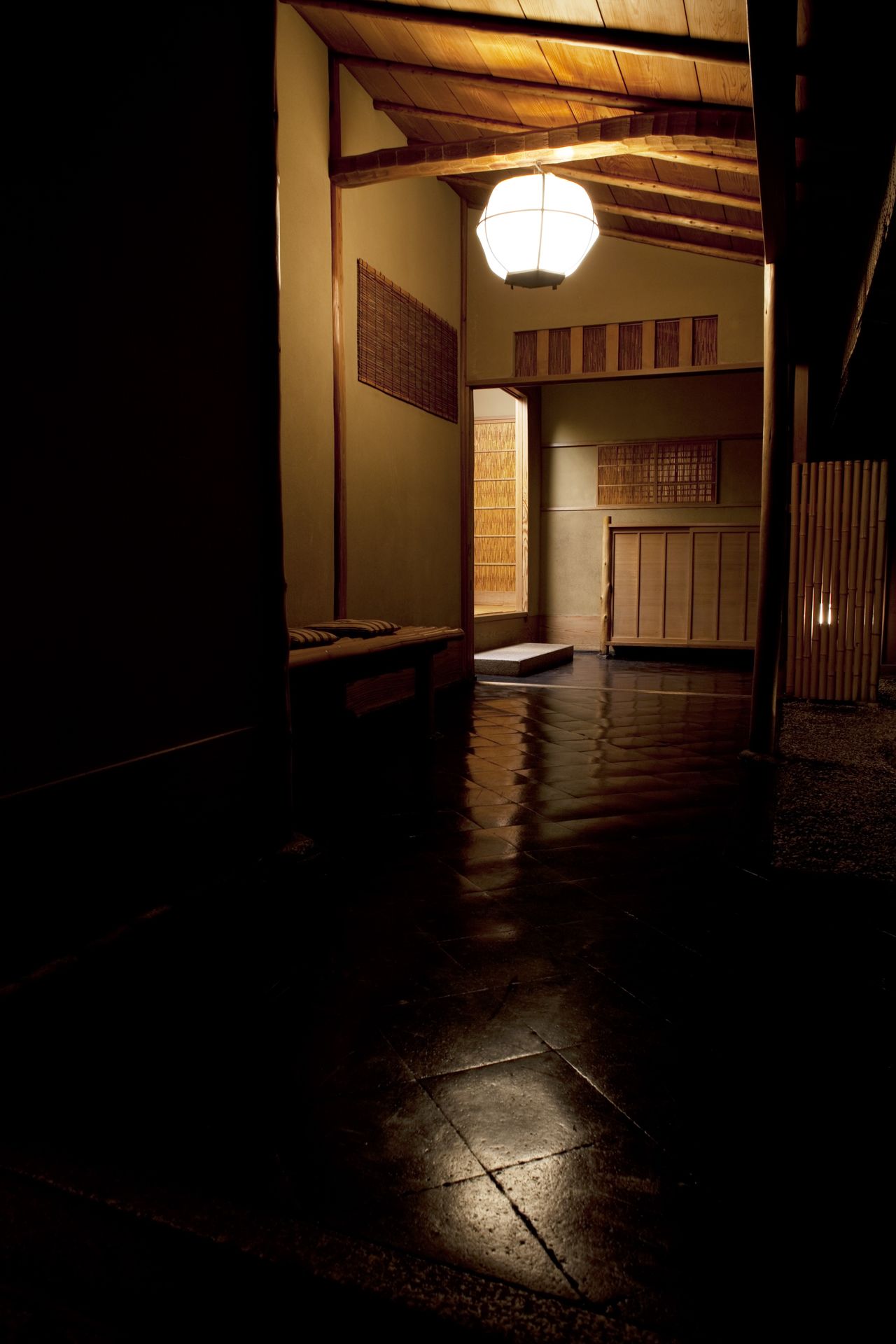 ほのかな闇の先に、灯がともる。玄関に至るアプローチ(© 高台寺和久傳)