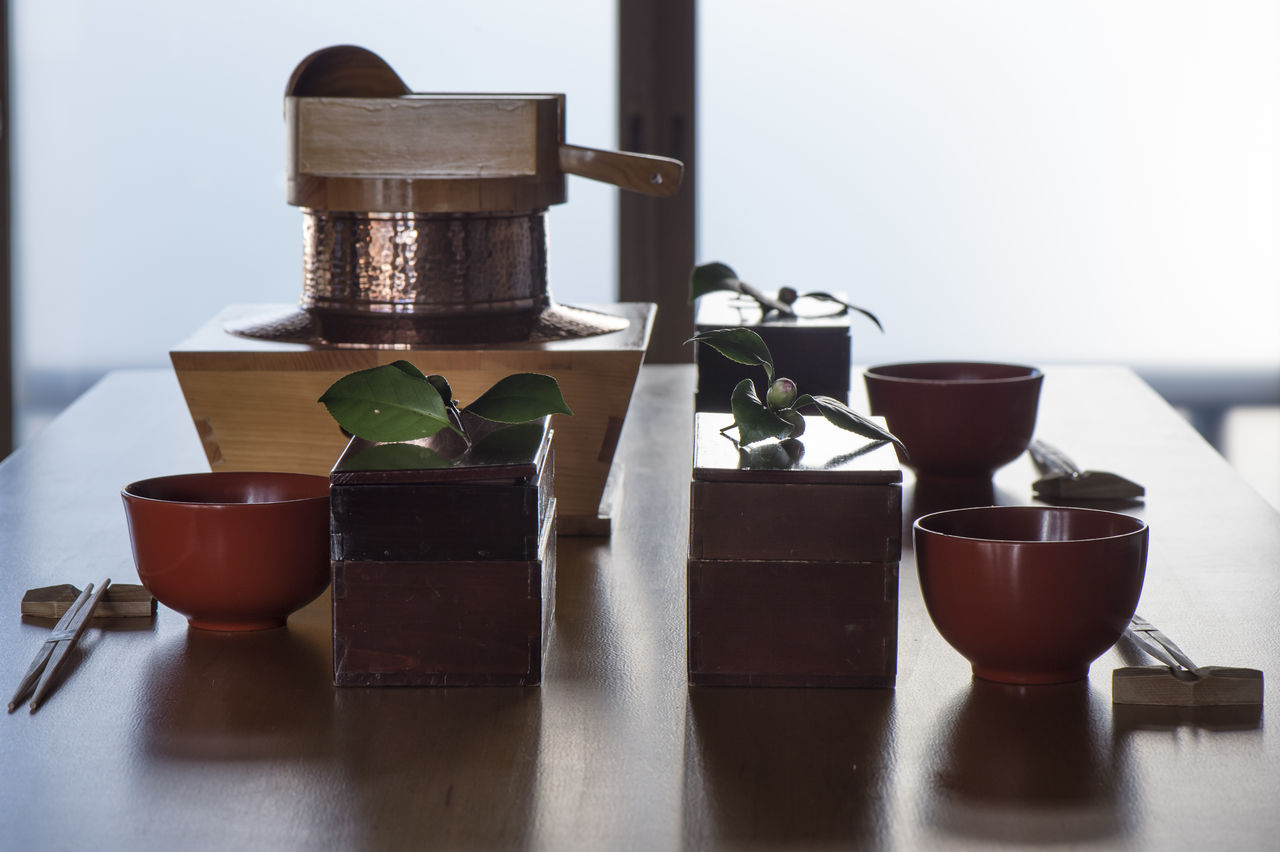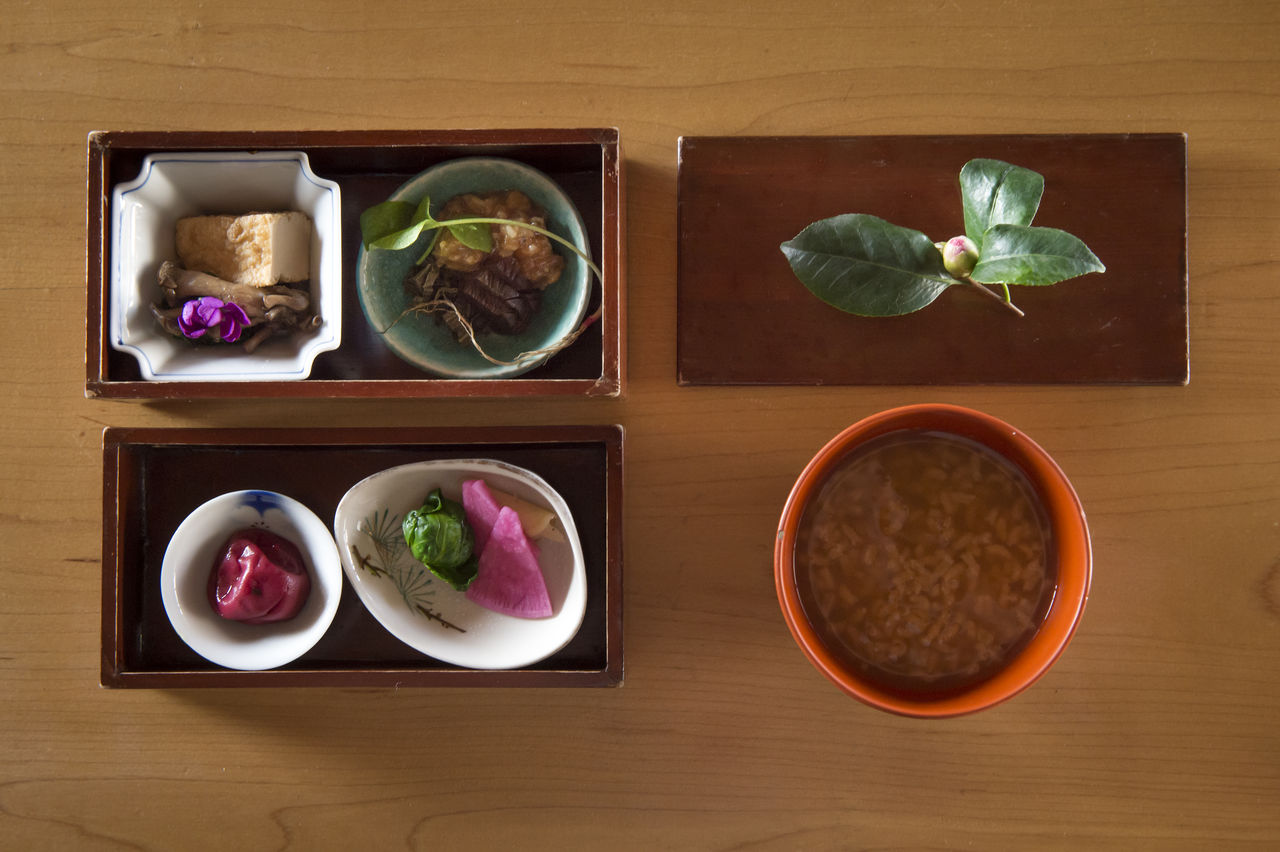 朝の茶粥に添えられた塗の弁当箱は、中谷が町の人から、そのような思い出とともに譲り受けた品。蓋を開けると、五條産の材料を使った心尽くしのおかずが並んでいる。質素をまといながら、剛毅で奥深い奈良がそこにはある。