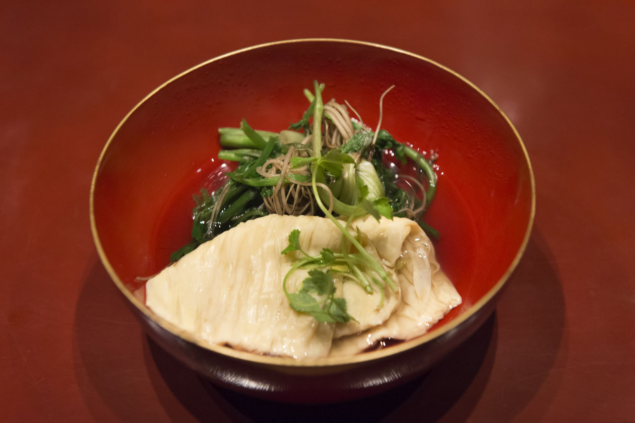 釜炊き湯葉。根付きのセリを潤沢に合わせる