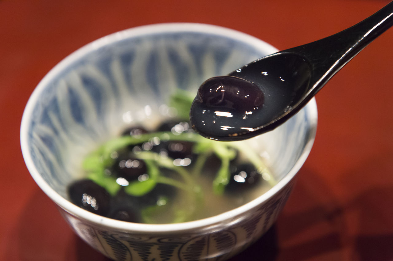 さっぱりと炊いた黒豆の旨煮は、ピーテンドリルの新芽を合わせ、吉野葛の餡をかけて