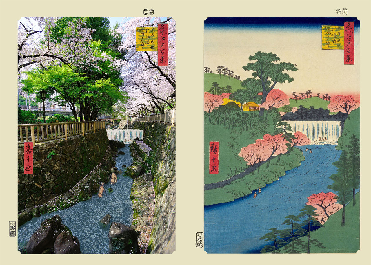 「名所江戸百景」は、ゴッホやモネなどに影響を与たことで知られる浮世絵師・歌川広重(うたがわ・ひろしげ)の傑作シリーズ。 安政3年(1856年)から5年にかけて、最晩年の広重が四季折々の江戸の風景を描いた。大胆な構図、高所からの見下ろしたような鳥瞰(ちょうかん)、鮮やかな色彩などを用いて生み出された独創的な絵は、世界的に高い評価を得ている。その名所の数々を、浮世絵と同じ場所、同じ季節、同じアングルで、現代の東京として切り取ろうと試みているのが、浮世写真家を名乗る喜千也氏。この連載では、彼のアート作品と古地図の知識、江戸雑学によって、東京と江戸の名所を巡って行く。