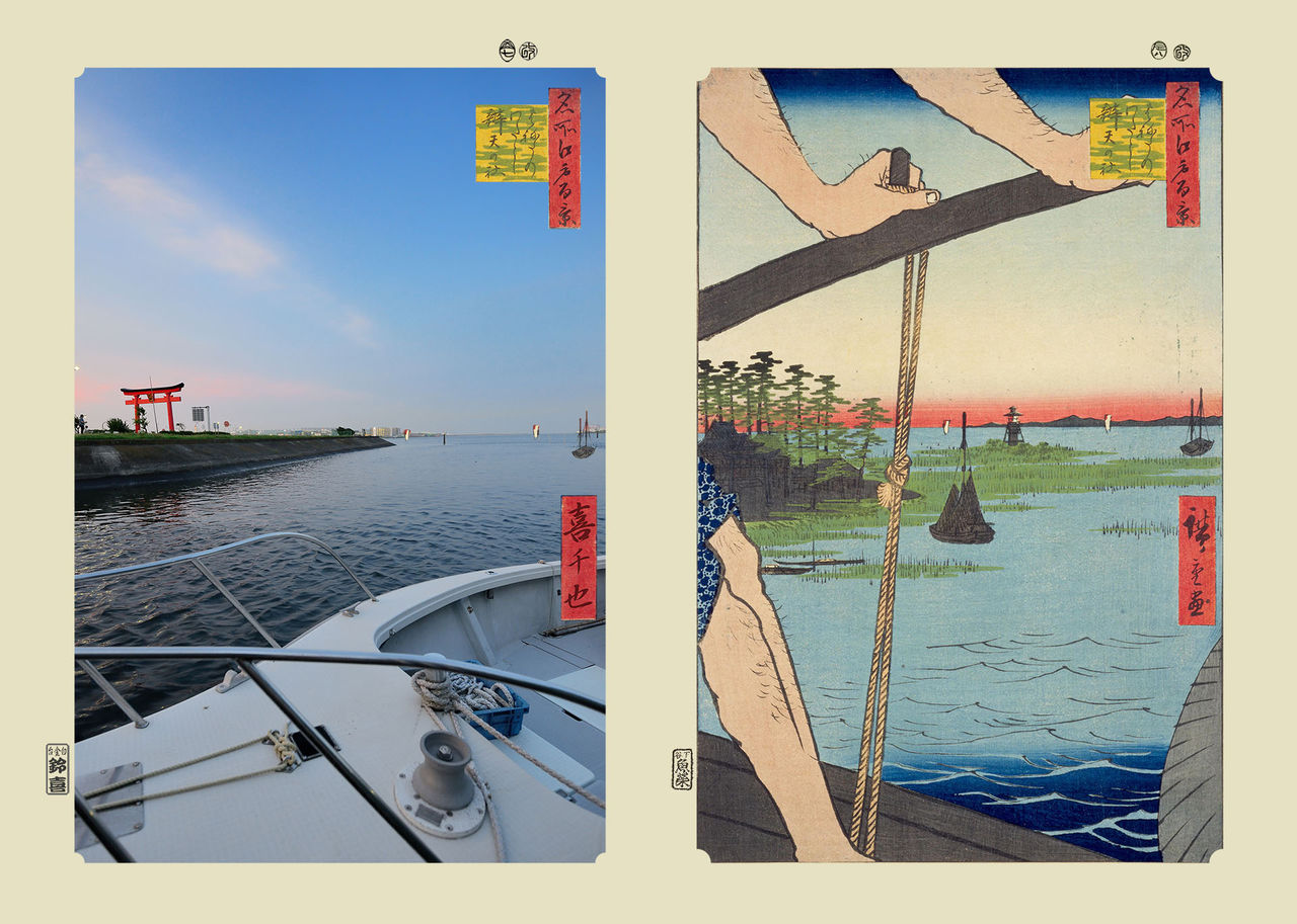 写真は弁天橋辺りから、渡し舟ならぬクルーザー越しに大鳥居方向を写したもの。ロケハンのつもりで出掛けたのだが、空模様が元絵に近く感じ、水平線の高さを合わせてシャッターを切ってみた。当世江戸百景の雰囲気が出せたので、この1枚を作品とした。