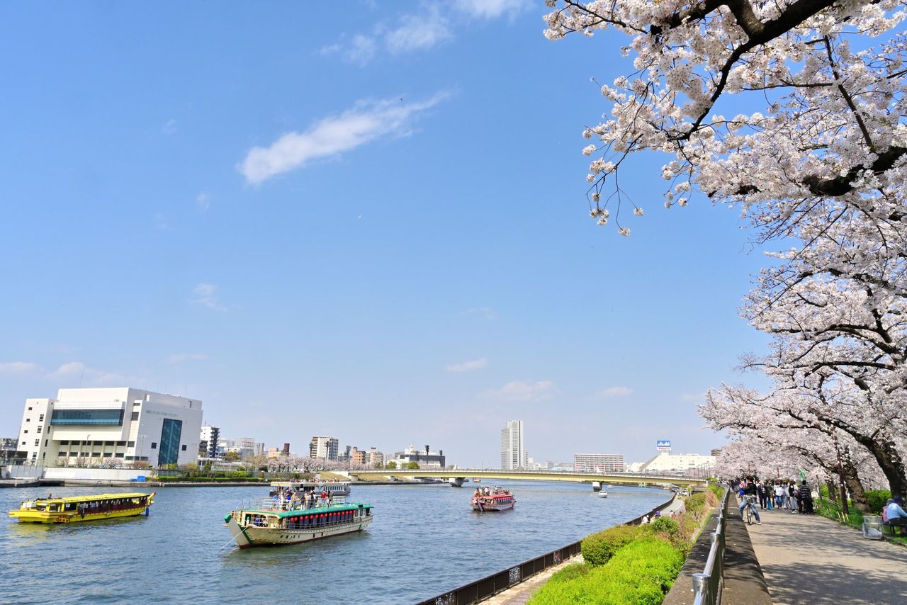 墨田区側の隅田公園の言問橋付近から北を眺めた。公園の歩道には人影が少ないが、川面には花見をする屋形船が集まっていた。対岸手前の白い建物が台東リバーサイドスポーツセンターで、北側の川沿いにテニスコートや野球場が続いている。その横に架かるのが、今回の作品を撮影した桜橋だ