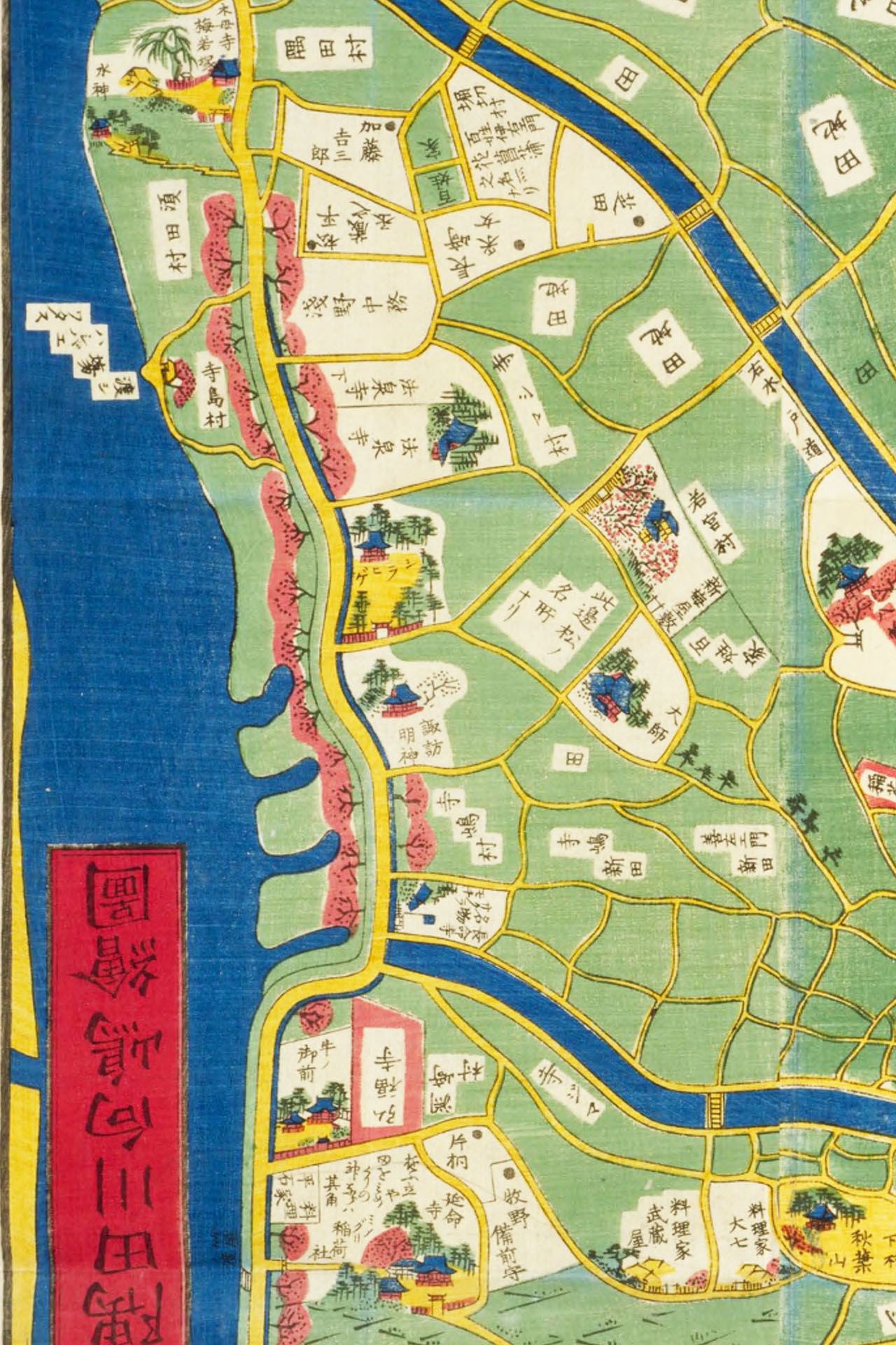尾張屋版『江戸切絵図』(1856年刊、国会図書館蔵)の「隅田川向島絵図」を切り抜き、北を上にした。左上の川面には「渡シ場 ハシバヘワタス」と記され、隅田堤の通り沿いにはピンクの桜並木が続く