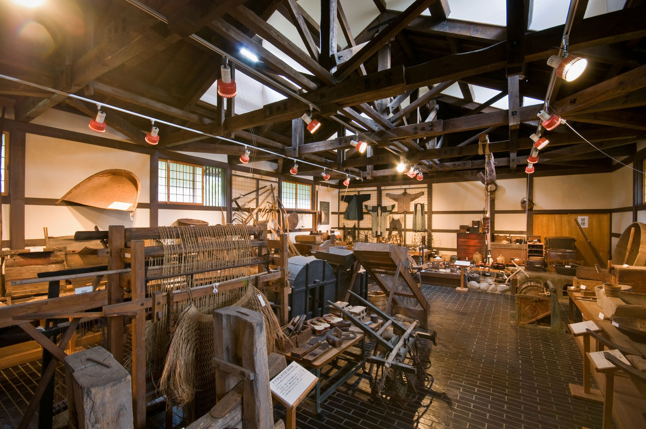 同資料館に隣接する「旧笠石家住宅」は、19世紀後半に建てられたとされる、茅葺き屋根、寄棟造の農家建築である。土台を用いず、柱が基礎石の上に直接立っているのが特徴だ。この地域の典型的な農民住宅で、国の重要文化財に指定されている。外観だけでなく、内部のかまどや台所なども建築当初の姿に復元されており、当時の暮らしぶりが実感できる。