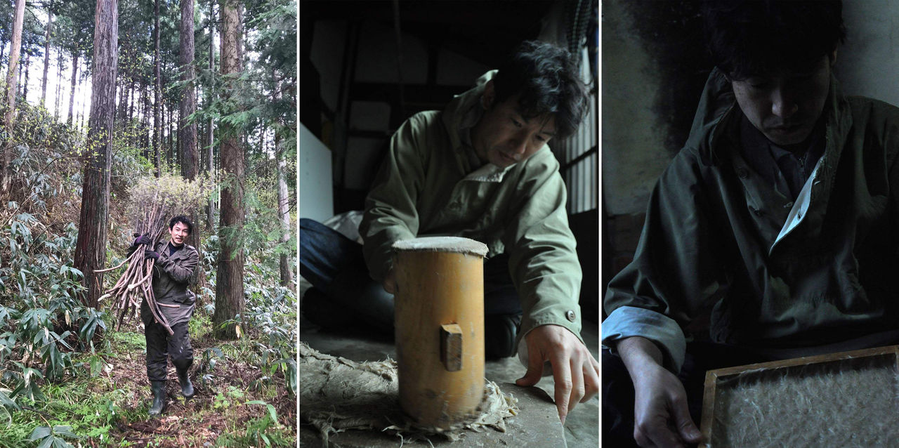左から、山で雁皮を取り、木づちで繊維を叩き、湧き水で紙を漉く 写真提供:山口和也
