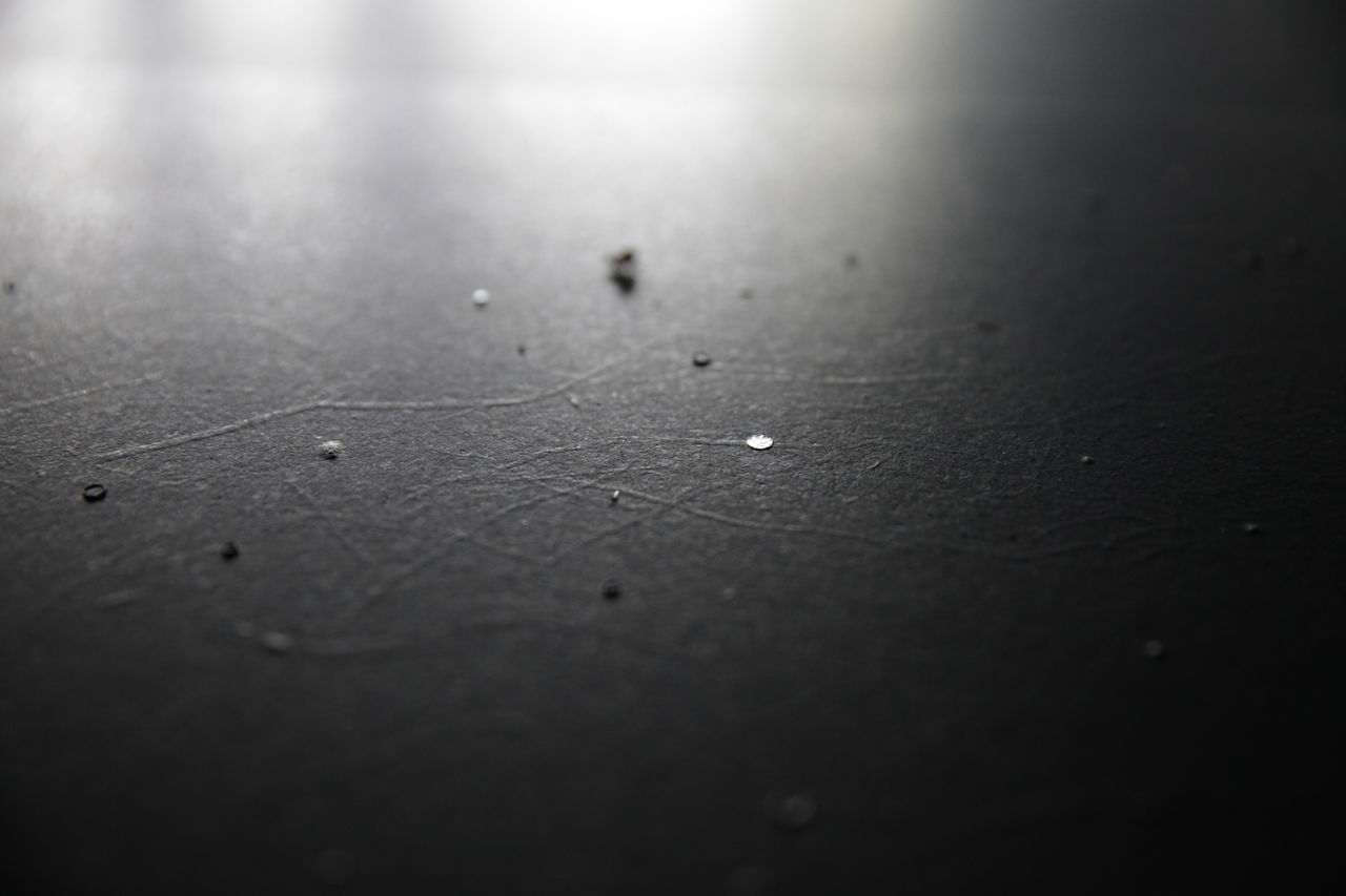 その雁皮紙を覆うように、松の木を燃やした煤(すす)と膠(にかわ)を原料とする松煙墨を真っ黒になるまで噴きかける。そこに、銀箔を一つずつ押していき、さらに、その上から再び墨を噴きかける。何度もこの作業を繰り返し、厚みを増していく闇の深さに反比例するように、かすかに残る銀箔の光の粒が浮き上がる。何万光年も彼方の宇宙から届く星の光を連想させる。仕上げは染料や顔料を調合した特製花火に着火し、画面に閃光(せんこう)を走らせた。目をこらすと、黒い画面のところどころに、青や赤の色が染み付いている。「瞬間の彼方にある永遠」がテーマだ。