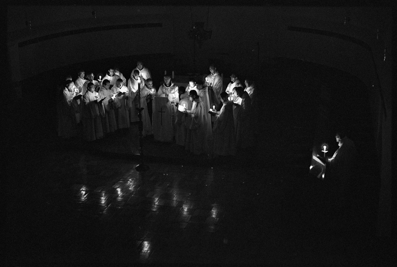 大聖堂に吊りさげられた聖母子像。若き彫刻家・舟越 桂がはじめてとりくんだ木彫だ。クスノキをつかい斬新な作風への転機となった記念すべき作品である。カトリックの彼にとり修道院は重たい存在で、その注文は、祭壇の真上にたつ幼子イエスをいだく聖母マリア。1年間、手がつけられなかった。だが、マリアさまも自分と同じく‶不安″を抱えていると思い至ってノミを持つことができた、と舟越は語っている。